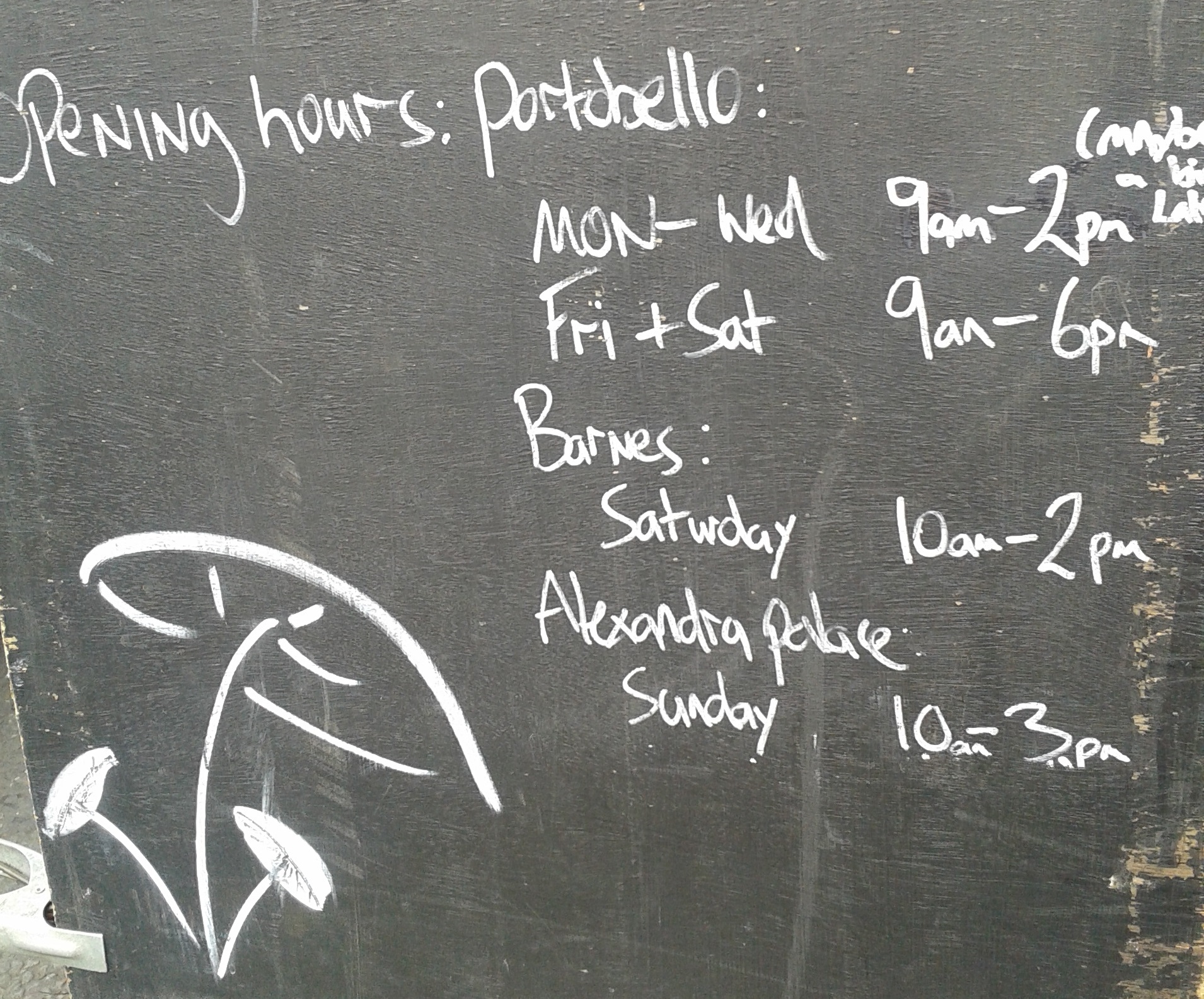Tom, sometimes known as Mushroom Man, welcomes the hordes of Portobello tourists with their cameras (for fb, tw and inst) each week in what is definitely a labour of love. He probably gets a fair number of people like me stopping by too, who know that mushrooms are good for you, and, well, that’s about the extent of our understanding…