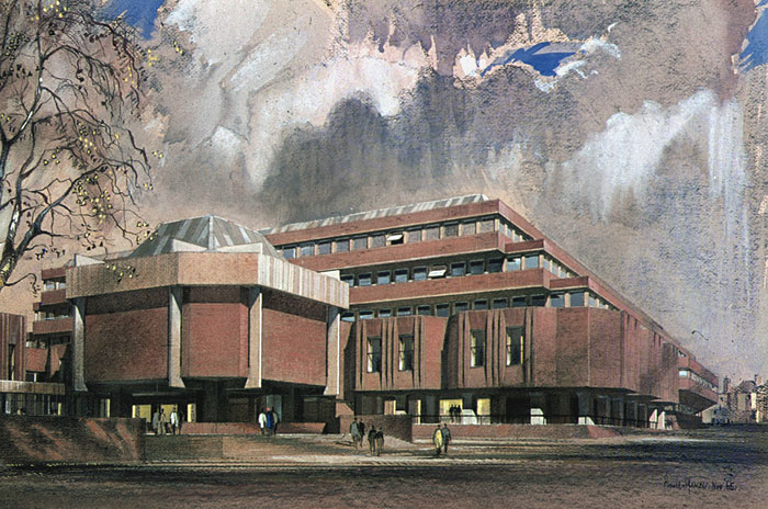 Watercolour of Kensington and Chelsea Town Hall by the architect Sir Basil Spence.Copyright: the Royal Borough of Kensington and Chelsea Libraries (RBKC Libraries)