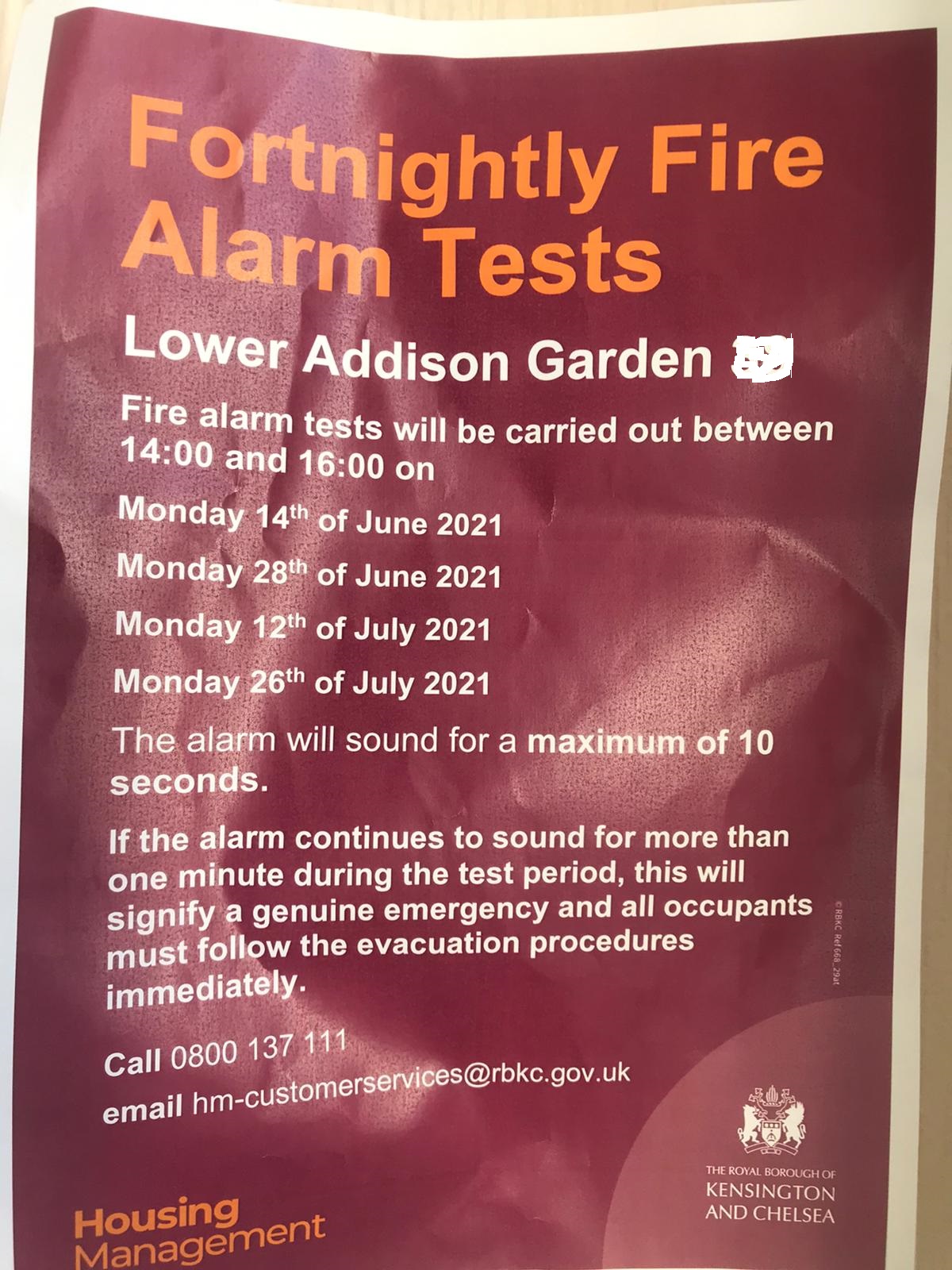 We just received the above image from a former Lancaster West resident. The image shows an official RBKC notice announcing that the council has designated 14th June, the anniversary of the Grenfell Tower fire, as the date for the first of a series of fire alarm tests in one of its properties.