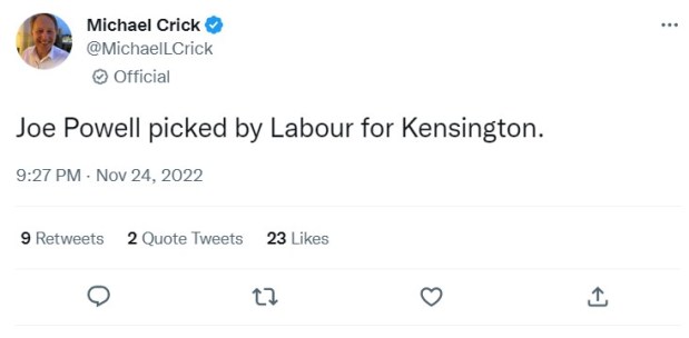 November 24th: The final hustings and vote is held in North Kensington, managed by London Region. The result is a comfortable victory for Joe Powell with 170 votes to Coban’s 90 and Lachaux’s 30. Powell will be Labour’s candidate, up against Conservative MP Felecity Buchan, who won by 150 votes in 2019.