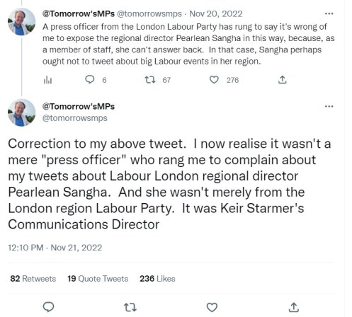 October 20th: Regional Director of Greater London Labour Party Pearleen Sangha dismisses two Kensington Selection Committee members for “openly supporting” a candidate. Sangha speculates about “a blatant attempt to undermine the process” – the two members reject the accusation.