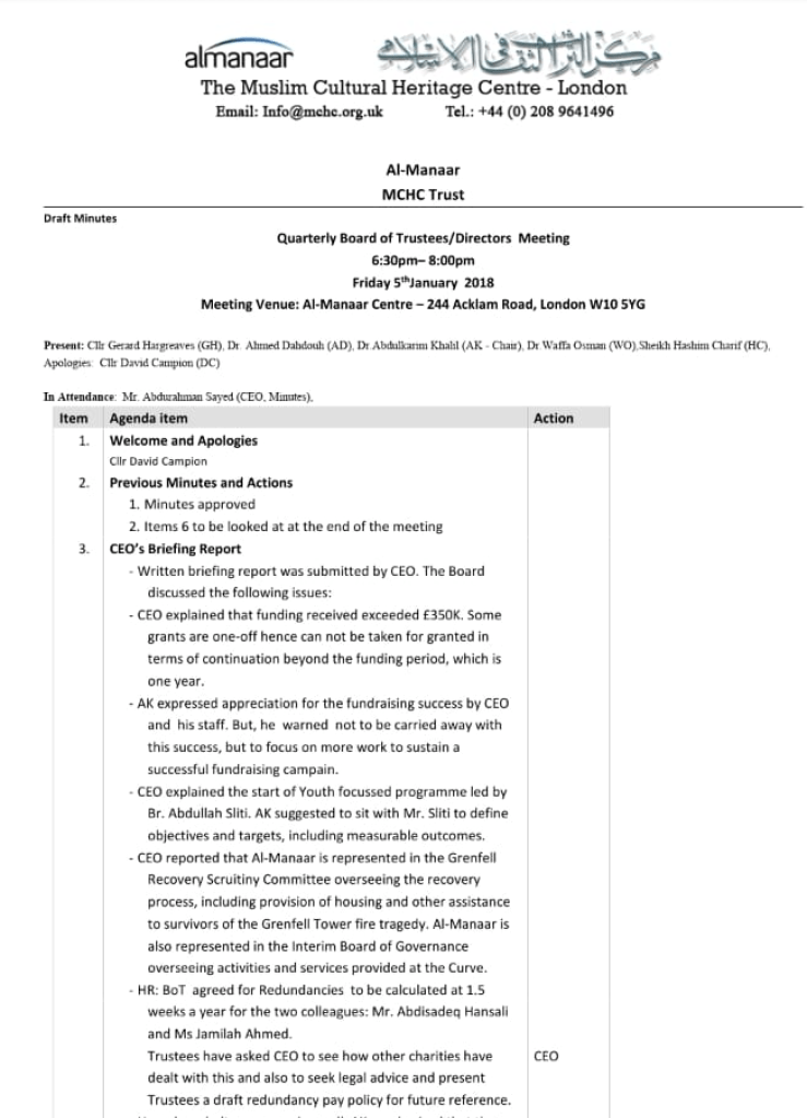 Minutes for the January 6th 2018 trustees meeting sent to Urban Dandy include two matters discussed without Dr Khalil, Chair of Trustees at the time, in the room. One was a request from Dr Khalil that al-Manaar contribute to his travel costs for flights to and from Libya. This request was deemed “inappropriate” by trustees as Dr Khalil was not travelling on al-Manaar business.