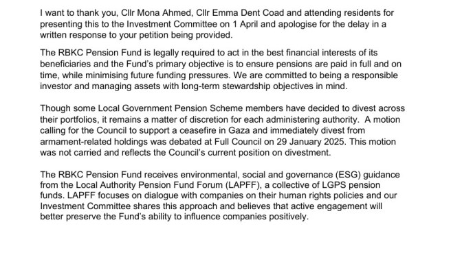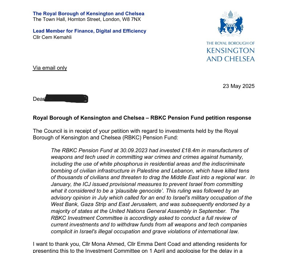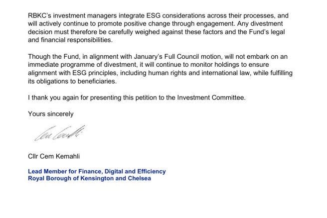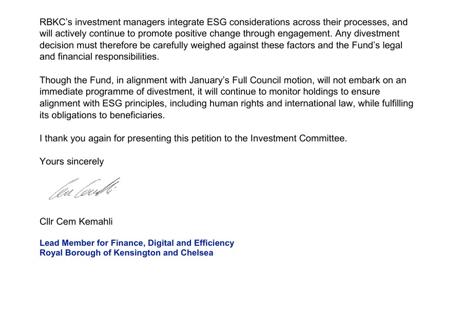Taking almost two months to respond, RBKC’s Lead Member for Finance, Cllr Cem Kemahli explained to a concerned resident that divestment remains “a matter of discretion” for the council. Cllr Kemahli also referenced the motion calling on RBKC to support a ceasefire and immediately divest in January, which councillors voted down. Kemahli stated that this vote “reflects the Council’s current position on divestment.”