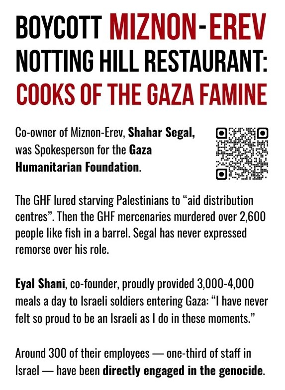 Since then, the small local protest group has resumed its actions outside Erev, handing out flyers and explaining the complicity of the restaurant’s two founders in Israel’s mass slaughter in the Gaza Strip. For just two protestors (aged 60+) outside Erev in late January, the Met Police sent two vans and 10 officers. The British political establishment has also continued their support of Erev, with a delegation from the House of Lords visiting the restaurant in February. In doing so, perhaps they are confirming that Erev is not just an unfortunate business caught up in political antagonism but is considered an important outpost for London Zionists and their supremacist, expansionist ideology.