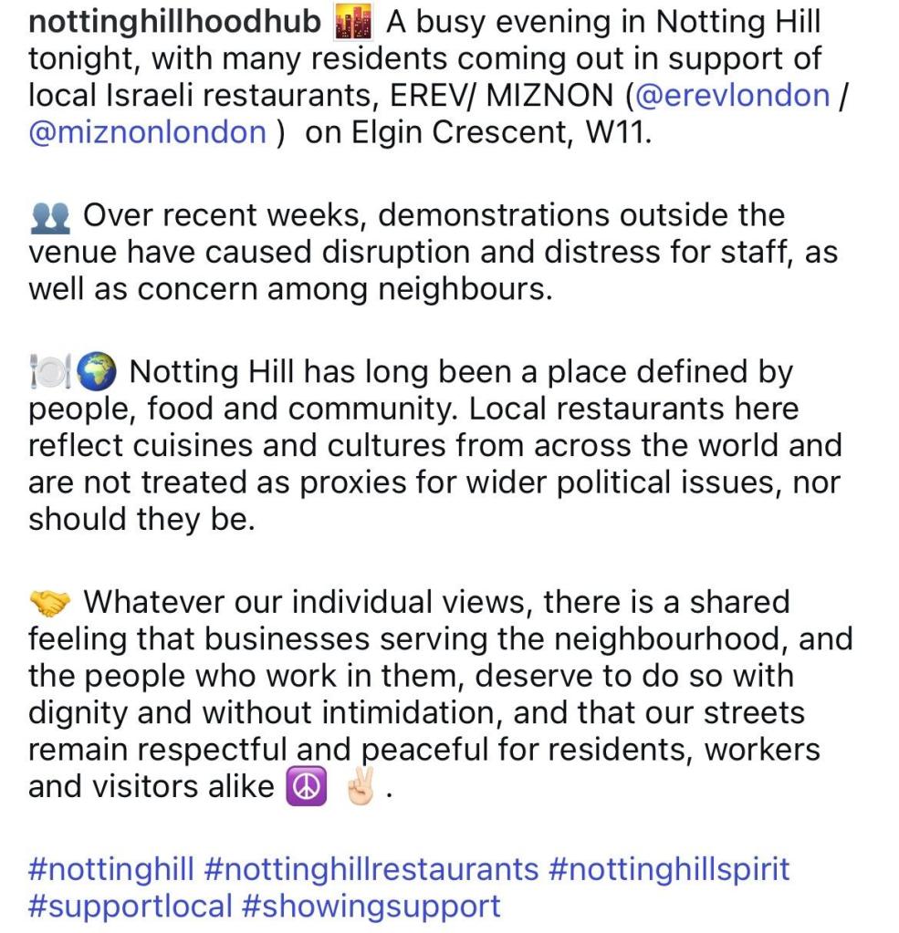 Did Notting Hill Hoodhub ignore us because it does not care about its reputation? This seems unlikely as the account has spent years portraying a love for local people and local culture. Hoodhub could be Zionists who support Israel’s war crimes, although there was no evidence of this before their Erev post. It could be they are on the payroll of the British state, tasked with generating a dumbed down image of the local area with happy hippy posts. Or it could be they were hoodwinked by the most manipulative and dangerous people around, the Zionist movement, currently trying to drag the whole world into war as they commit their latest atrocities in Iran and Lebanon.