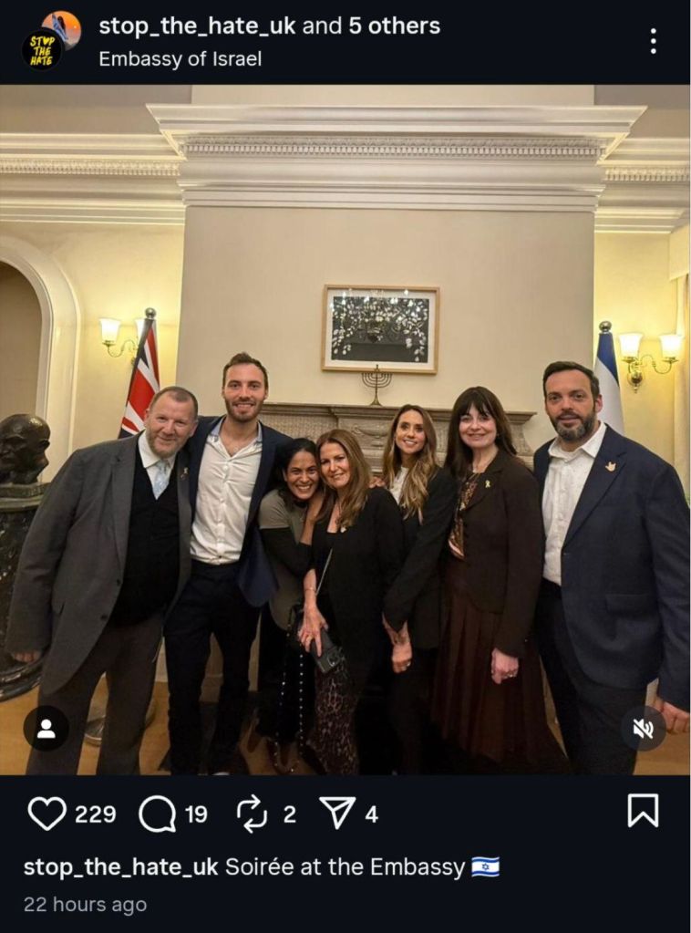 Also in Hoodhub’s video is Kurpa Patel, the other face of Our Fight UK. Like Birbeck, Patel had previously visited Erev to goad and disrupt anti-genocide protesters. An evangelical Christian, Patel has been photographed at the Israeli embassy after meeting with the openly genocidal ambassador Tzipi Hotovely.